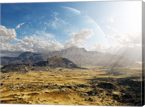 Own a museum-quality reproduction of Clouds break over a desert on Matsya, giving a glimpse of the planet Samandar by